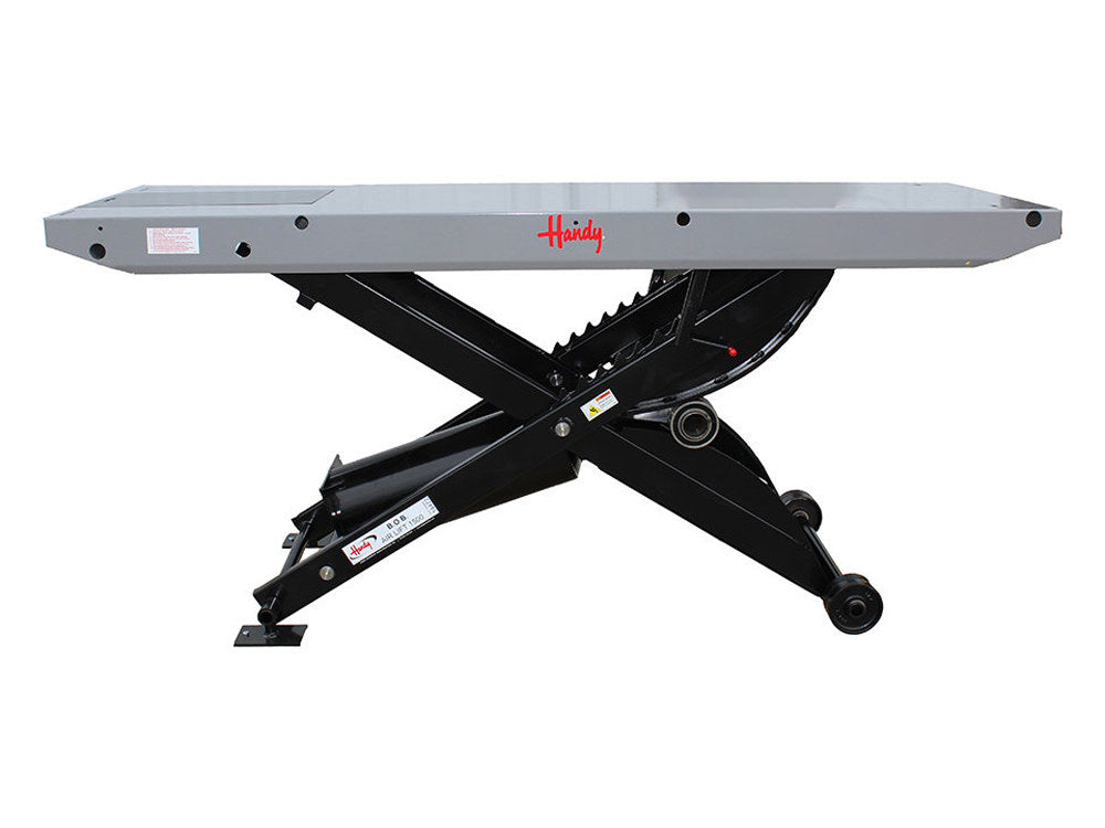 Bigger, wider, taller — meet the B.O.B. 1500 Air Lift from Handy! With a lifting capacity of 1500 lbs., the B.O.B. is the perfect lift for servicing motorcycles, trikes, ATVs, small UTVs, and lawn tractors. The B.O.B. 1500 raises to a working height of 40? for even the tallest mechanics and features a drop-out panel to make tire changes convenient. This lift features a durable powder coat gray finish on the lift top, paired with a black powder coated frame. Made from durable 11 gauge domestic s teel, this “Beast of Burden” is ready to work when you are! As with all Handy products, the B.O.B. 1500 Air Lift is proudly made in the USA.Product Specs:* Capacity: 1500 lbs.* Work Surface: 84? x 28?* Max. height: 40?* Min. height: 10?* Air source: 90-100 PSI* Ramp length: 40?* Standard color: Gray top with black frameSuggested additional purchases – HAN-14476 cycle vise and HAN-21300 trike extension kit