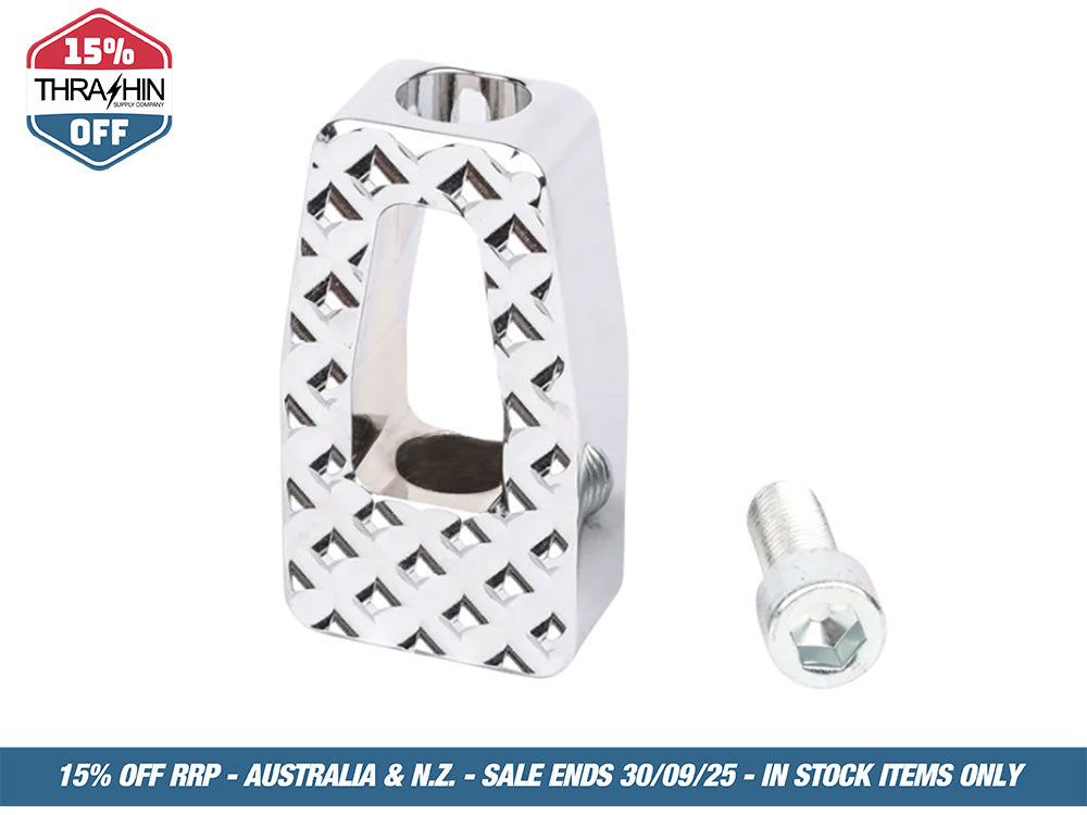 Features & Benefits:-* Also works as brake pedal for THRASHIN® Softail Brake arm. * Made in U.S.A* Billet 6061 Aircraft Grade Aluminum* Triple Nickel Plated Chrome Finish* Comes with one 5/16-24 x 7/8? SCHS* Fits all Harley-Davidson® models* Made in Los Angeles, CADOES NOT WORK WITH THRASHIN® ADJUSTABLE BAGGER BRAKE ARM.
